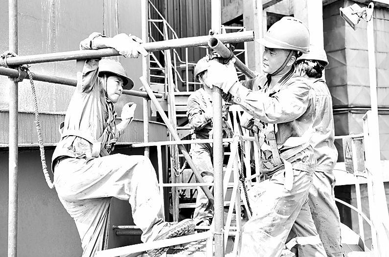 入夏以来,泉州地区气温节节攀升,气象台连续发布高温橙色预警。为抢抓发电黄金期,石狮热电公司检修人员全力做好设备检修保障工作,主动打好迎峰度夏攻坚战,全方位确保设备安全和机组稳发多发。图为检修人员冒着烈日搭设脚手架准备维修吸收塔。(谢志敏摄影报道)
