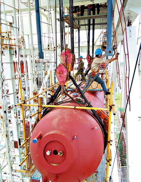 图为汽包吊升到位。 9月12日11点30分,经过3个多小时紧张有序的精心操作,晋南热电工程#2锅炉汽包(连同底座、架管超过50吨),安全顺利地升高到43.9米,宣告了又一重大节点的完成。