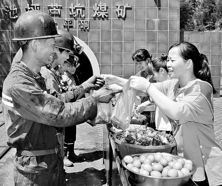 6月4日下午,在端午节来临之际,永安煤业公司池坪芦坑煤矿女工家属协管员们在井口为上下班的采掘工送去粽子、平安蛋”等食品,并嘱咐他们一定要注意安全。