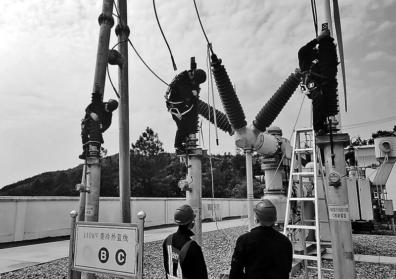 4月8日,福能新能源公司外山风电场开展为期5天的年度停电检修工作,对全站设备进行隐患排查和设备消缺。图为4月9日,检修人员对线路避雷器三相套管进行清洁。