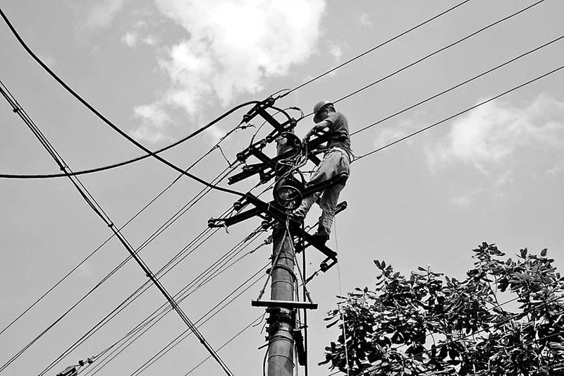 针对夏季用电高峰,天湖山能源公司认真做好生活用电线路巡查及维护工作,保证职工用电需求。图为近日,多管部电工顶着烈日正在排除故障。(黄艺欣 摄影报道)