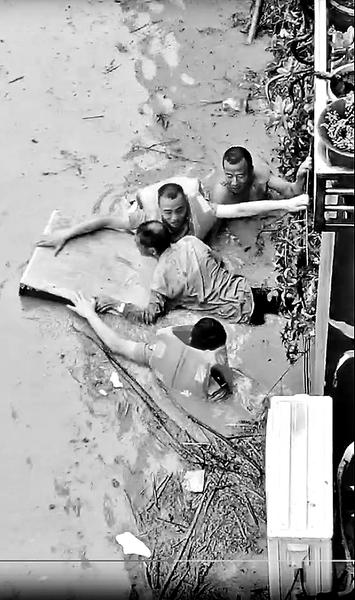 图为蔡元光、林献忠和干警利用门板合力将张金蓝父亲从家里救出,送往安全区域。(黄华清摄)