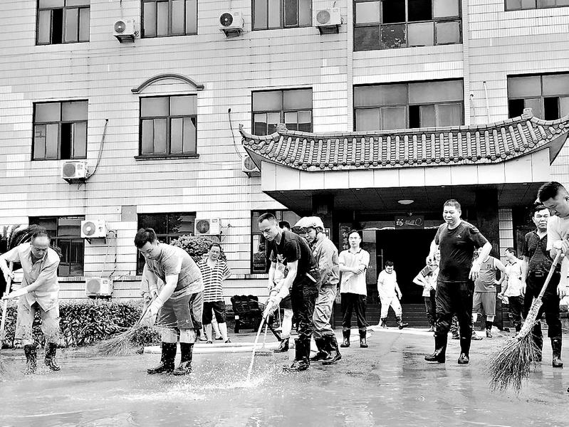 图为该公司领导与职工一起清除办公楼前淤泥。