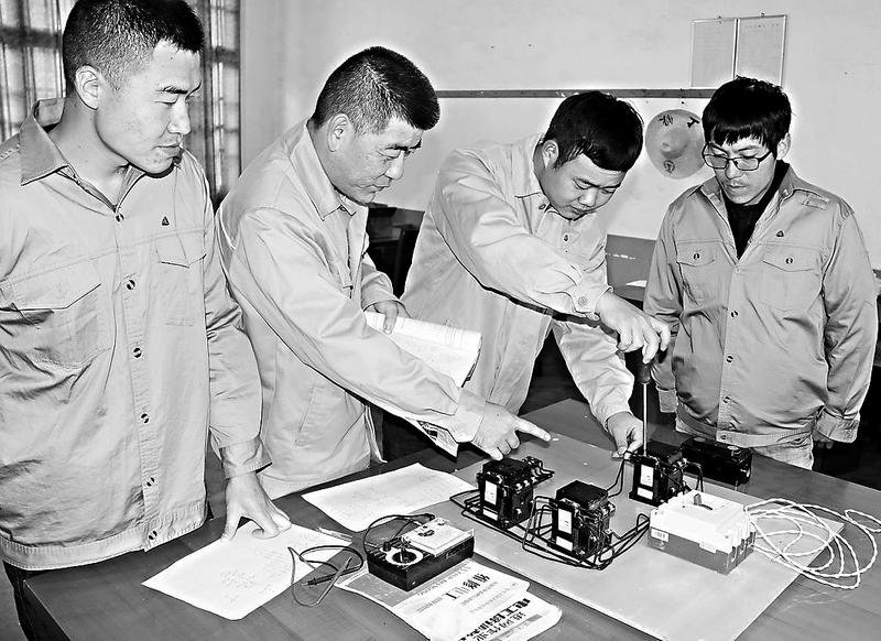 今年以来,永安煤业公司上京供电所通过开展青工拜师学艺、班后学习、技能比武和现场培训等多种方式,切实提高青工的岗位操作技能。图为4月9日,维修电工技师李福庆(左二)在工区办公室指导青工练习安装电机新三角启动控制线路。