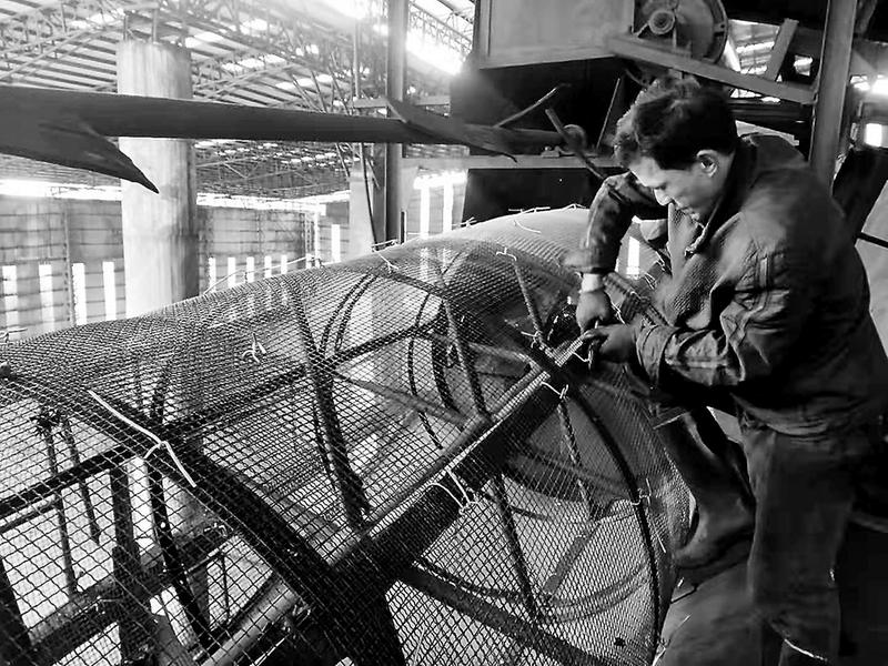 近日,福建煤电雁石发运站组织党员生产突击队对老旧磨损的筛煤大圆滚筛铁架“筋骨”进行更换并重新焊接。图为工作人员正在焊接铁架。