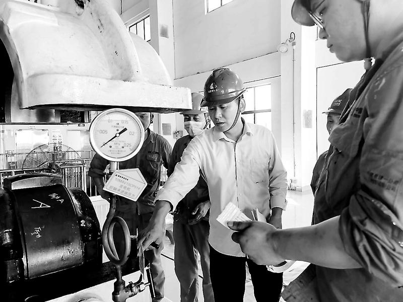 8月22日,晋南热电设备部汽机班组利用机组轮换间隙,在汽机房内组织#1机组临停检修维护作业,保障设备状态良好。图为汽机点检工程师正组织测验汽轮机轴瓦参数。(陈嘉楠 摄)