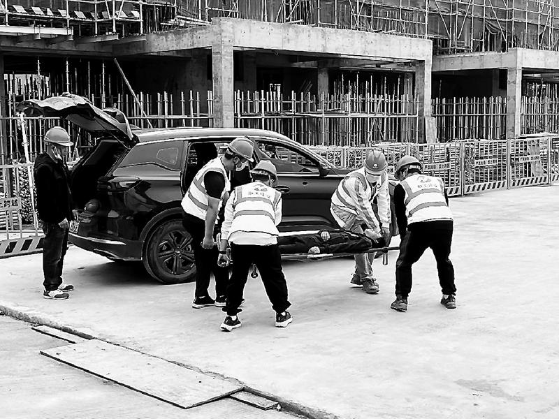 11月3日,联美公司连城美伦山水翰林苑一期项目举办施工现场触电事故应急救援演练。图为急救演练现场。(田震 潘方斌 摄)
