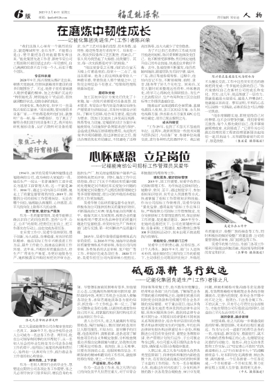 吴爱华在工作中 1994年,18岁的吴爱华满怀憧憬走进福能南纺公司,成为南纺大家庭的一员。她在生产一线从一名普通操作工逐步成长为基层工段管理人员,这一干就是20年。2014年,通过公司内部公开招聘,她走上了质量监督管理员岗位;2019年,调整到公司的招标工作管理岗位。无论在哪个岗位,她都能认真履职、心怀感恩,在平凡的岗位上取得不凡的业绩。