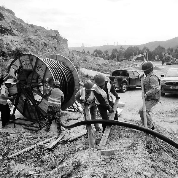 近日,为尽快破解矿山加工区生产线用电瓶颈,新材公司权属漳州公司与供电线路施工单位紧密配合,啃”下了建设用地征迁的最后一块“硬骨头”,全力以赴推进项目建设。目前,供电线路施工已接近尾声,矿山供电专线全线贯通并通过供电部门验收。图为施工人员正在敷设电缆。(林婉贞 摄)