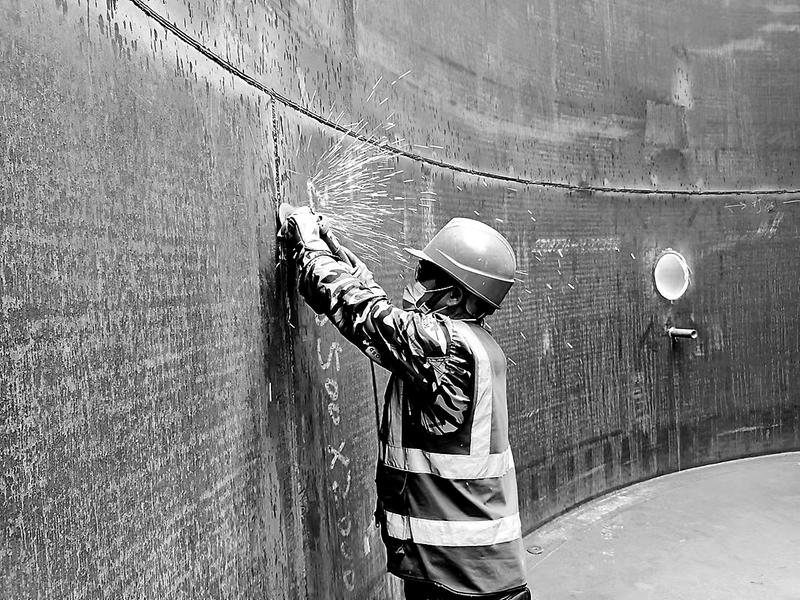 烈日当空,龙安热电公司扩建项目脱硫塔内就像一座桑拿房。为保证脱硫塔安装进度及质量,近日,龙安热电公司员工不惧酷暑,正在脱硫塔内打磨焊缝。(温清华摄)