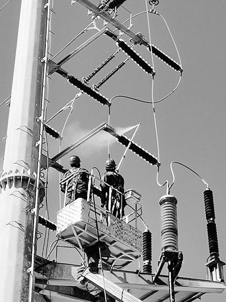 11月21日,晋南热电公司组织人员对110kV山源屿路#1杆塔电气设备进行带电清洗,为入冬后露天电气设备的安全运行做好充分准备。(周国利摄)