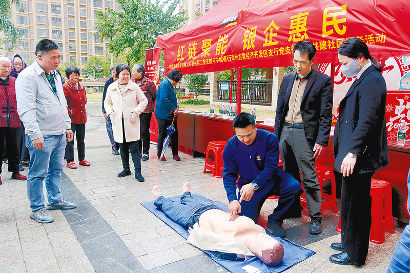 3月5日学雷锋纪念日当日,海泉化学公司机关第二党支部与中国银行漳州古雷经济开发区支行党支部携手,在漳州古雷新港城开展“红链聚能银企惠民”党建共建活动,以实际行动传承和践行雷锋精神。图为消防人员在应急救援指导区,演示心肺复苏操作流程。(文/张璟昊