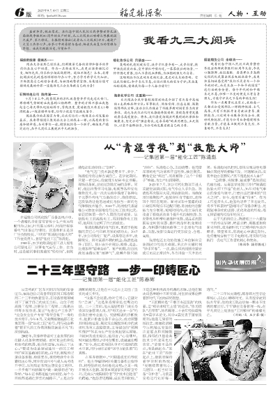 本次阅兵令我印象特别深刻的是介绍了首次集中亮相的4支战略兵种方队:军事航天、网络空间、信息支援、联勤保障部队方阵,这些方队体现出了科技革新对国家实力的重要性。这也与我们石化行业推进科技创新、实现高质量发展的要求高度契合。将来,我们要发扬阅兵所展现的纪律性和凝聚力,坚定公司“强企有我,追求卓越”的共同理念,立足岗位,以实干诠释担当,为公司的发展贡献自己的力量。