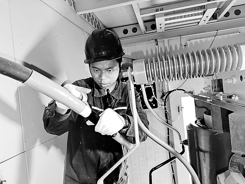 4月12日,福能新能源公司隆教风电场检修班组连续两昼夜加班加点、全力奋战,抢抓对侧停电宝贵作业窗口期,以高效执行力圆满完成20台风机箱变高压侧电缆终端头全面排查与更换作业。图为检修人员正在对隆教#30风机箱变高压侧电缆终端头进行维护。 (江伟忠 摄)