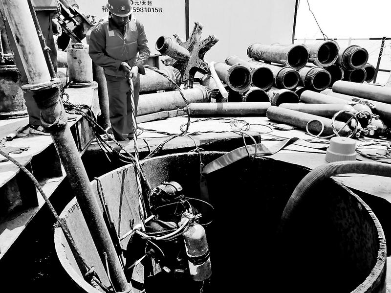 针对S2机位6#孔桩施工中遇卷边问题,三川海上风电公司及时组织施工、监理、设计单位相关专家进行技术问诊。图为8月14日,潜水员按会诊技术方案,下潜至S2机位6#孔桩-36米处进行水下卷边切割处理。