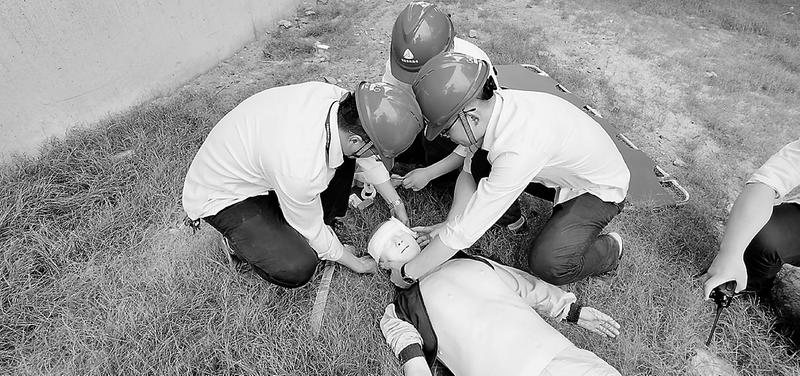 8月27日,晋南热电公司组织开展高处坠落伤亡事故应急救援实战演练。图为参演人员正在抢救“伤员”。