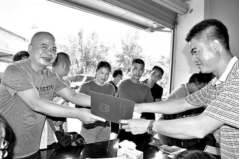 (郑延玲 摄影报道)图为郑汉文(左一)正在领房屋产权证。