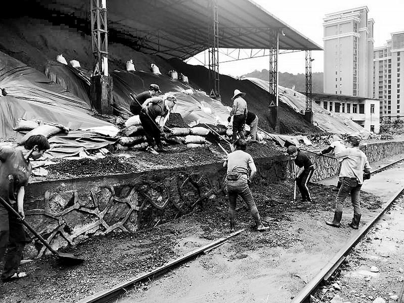9月8日,突发的暴雨造成了天湖山能源公司筛选厂煤场的煤炭流失。为减少经济损失,该公司及时组织人员回收流失煤炭,并加固雨布。图为该公司工人正在清理流到铁路专用线上的煤炭。(潘志扬 李强 摄影报道)