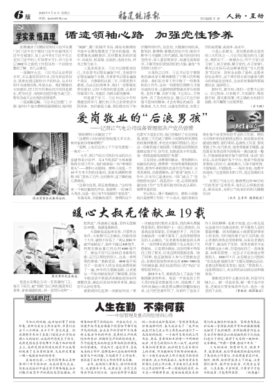 腔热血”,传递着正能量,坚持无偿献血19载。他就是黄新武。无偿献血说起来容易,只要符合条件,大家都可以去献血,但能坚持十几年,就很不容易了。我从2001年就开始献血了,每年不超过400毫升,到现在献血量已经达到4800毫升了。献血不仅可以加快自身新陈代谢,还可以帮助到别人,这是一举两得的事情。黄新武说。4800毫升相当于一位成年人将全身血液都更新了一遍,19年的无偿献血路,让老黄从一开始对献血知识了解甚微,到如 今能滔滔不绝地讲述献血前该如何调整饮食,献血后该如何保养身体,献血有什么好处等等。