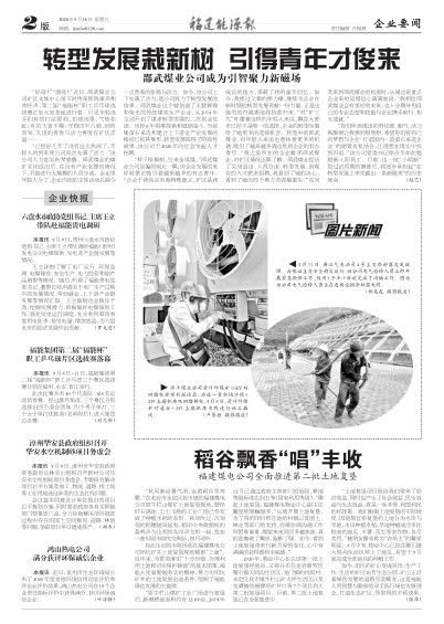 “秋风渐凉暑气消,金黄稻谷笑弯腰。”在龙岩市永定区抚市镇的福建煤电公司原牛栏山煤矿土地复垦现场,曾经矸石满地、尘土飞扬的工业广场已然变成了种植水稻的农田。秋风吹过,沉甸甸的稻穗随风摇曳,稻田中央收割机的轰鸣声与山间的鸟叫声交织一起,犹如一曲田园丰收的交响乐,悦耳动听。