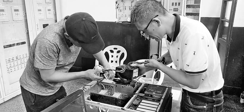 近日,福建煤电供电公司翠屏山变电站电网后台保护监测主机因受雷击而损坏。故障发生后,该公司运检部工作人员共同努力,及时消除故障,电网恢复正常在线监测。图为工作人员放弃周末休息时间展开抢修。(张萍摄影报道)