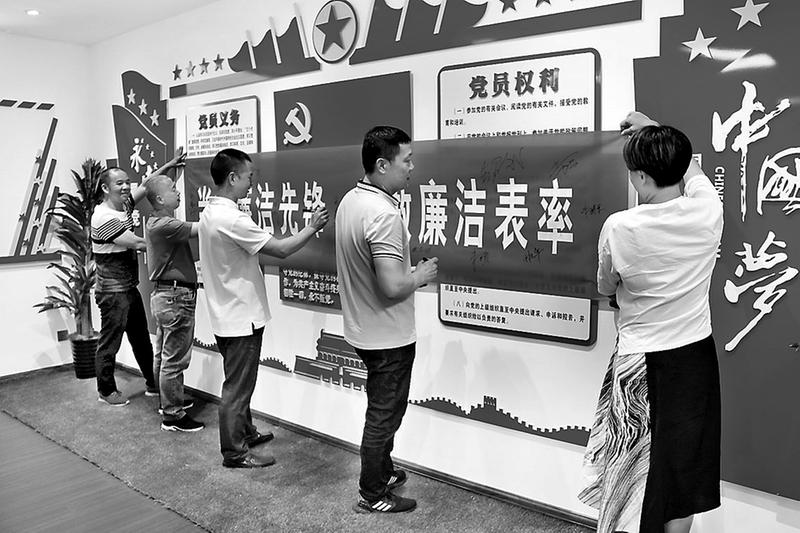 9月15日,永安煤业物供分公司开展2020年中秋国庆廉洁过节教育活动。图为党员在“当廉洁先锋做廉洁表率”横幅上承诺签字。 (靳静 摄影报道)