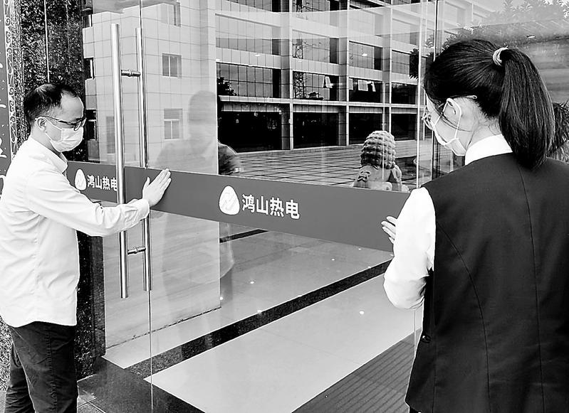 6月10日,按照集团党委对集团VIS系统应用提出的宣贯要求,鸿山热电公司立即制定贯标工作计划,根据对外宣传展示重要性及施工难易程度分区域明确具体目标任务、时间表、责任人,迅速完成对外宣传展示重点区域、参观通道原有标识拆除工作和各门牌数量收集与统计,并充分利用电子屏、工作群等载体,大力宣贯集团企业标识。图为该公司员工正在安装新的防撞条。(刘寒婷摄)