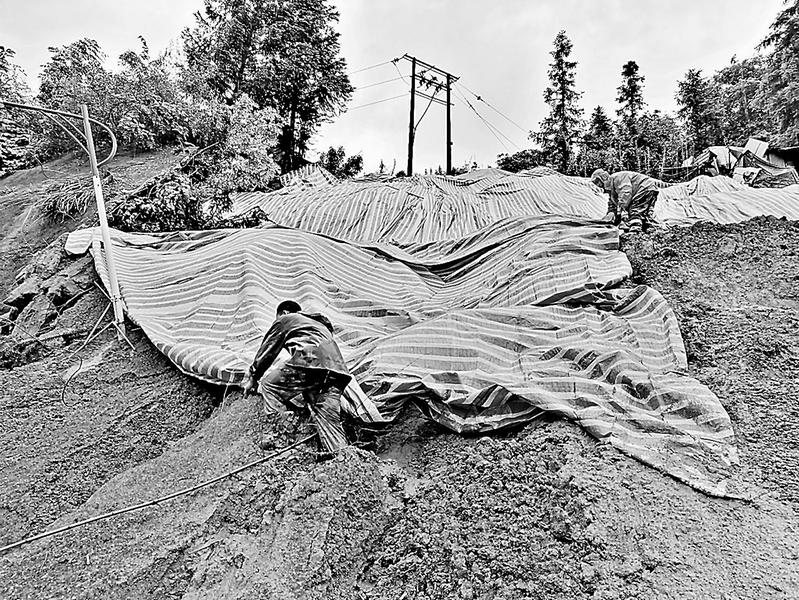 (郑震恺 摄影报道)图为抢险人员正在处置山体挤压溜方