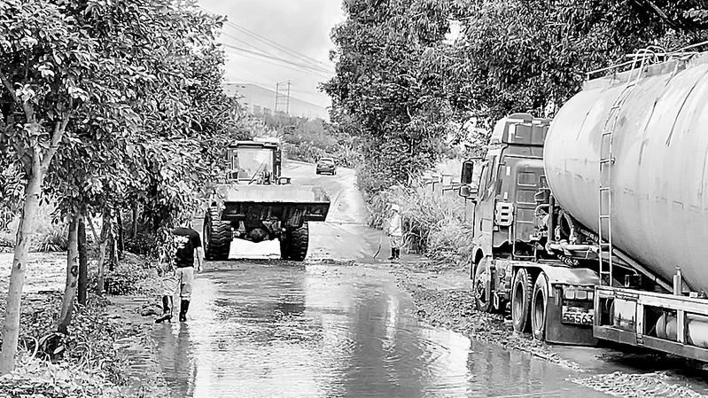6月13日,龙岩市新罗区将暴雨应急响应提升为I级,建材控股龙岩混凝土公司所在的铁山镇被列为新罗区红色预警区域。该公司各部门负责人严防死守、靠前指挥,对重点区域提前布控。图为该公司员工正在清理厂外道路。(邱磊摄)