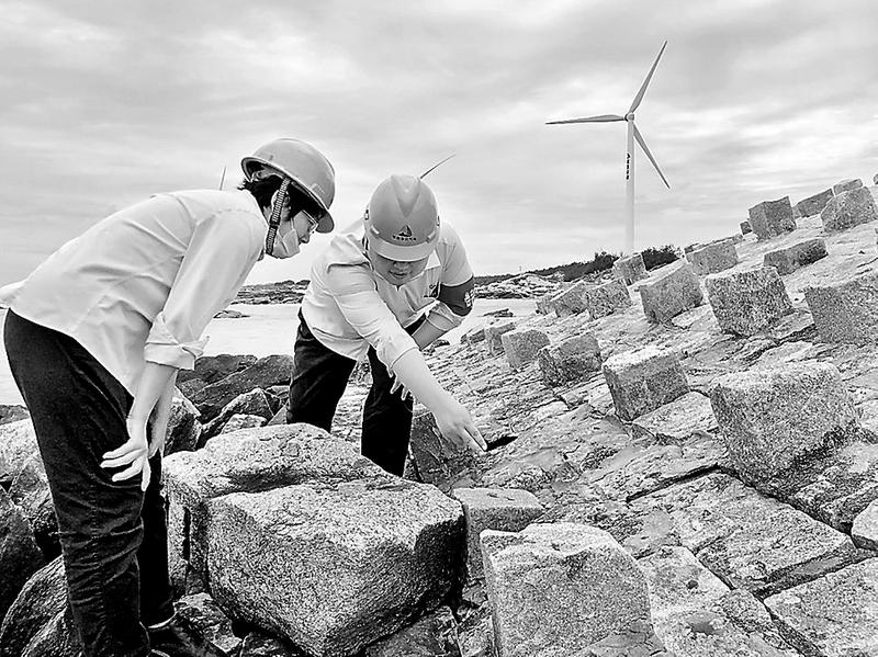 针对近期泉州地区持续降雨,晋江气电公司所属晋江风电场全力做好安全防范工作,组织人员排查风机防浪堤坝事故隐患。图为近日,工作人员正在排查风机防浪堤坝。(王聪颖摄)