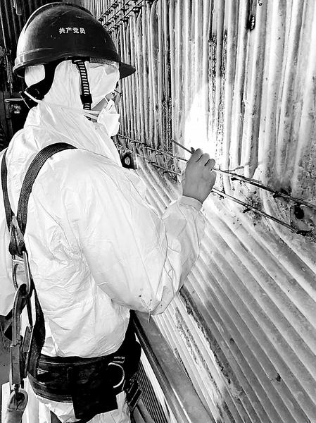 图为该公司锅炉专业技术组成员李文举正在检查焊接骨架。 “武工,这个骨架焊接过程没有伤到水冷壁管吧。”在今年的机组检修期间,鸿山热电公司锅炉专业技术组成员李文举正在炉内升降平台上对水冷壁管进行检查。