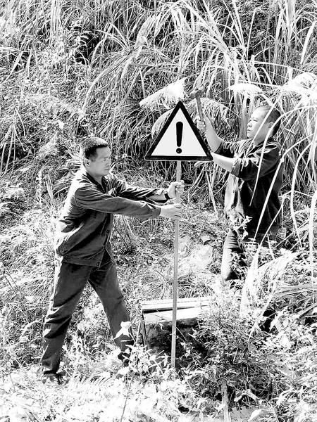 近日,漳平煤业物业管理开发公司组织对辖区内的生态恢复治理组织全面检查,并对各区域重新设置监测点、设立警示牌等警示标识。图为管理人员正在设立警示牌。