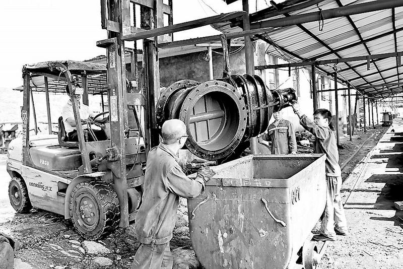 6月份以来,福建煤电公司龙潭煤矿在井下306采区新建一个区段水泵房,增加水仓容量为1400m³ ,目前已经进入后期管道安装阶段。图为8月1日,机电队机修人员用叉车吊装水泵闸筏装车准备运送到井下。(陈思忠 摄)