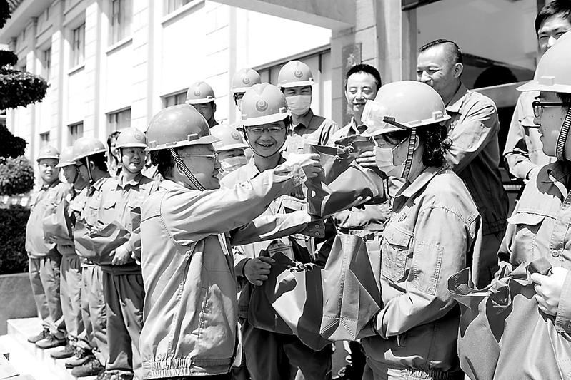 8月中旬,福海创公司工会开展“夏送清凉”高温慰问活动,能化集团省管干部黄仔清,福海创公司党委书记、董事长李邦雄,福海创公司党委委员、副总经理、工会主席鄢志晖一行向奋战在高温下的职工们致以诚挚问候,并送上清凉饮品和防暑降温物资。(陈志杰 揭丹 摄)