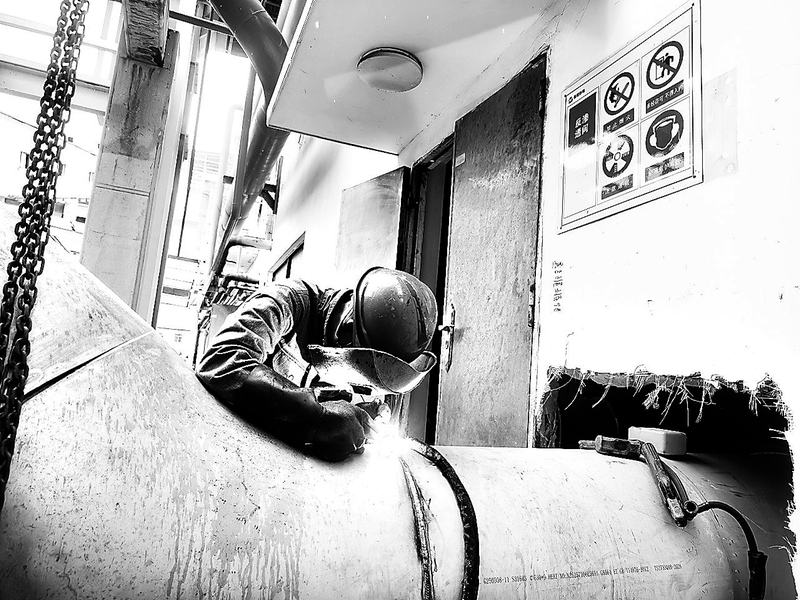 8月4日,晋南热电公司正在进行锅炉补给水系统升级项目中的二级反渗透系统进水管道安装工作。图为现场施工人员正在焊接二级反渗透进水管的焊缝。 (黄闽榕 摄)