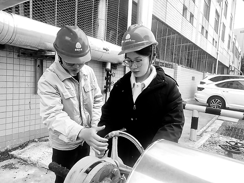 2024年度被评选为公司“先进生产(工作)者”的陈歆蕾是其中绽放的一朵,普通却不平淡,艳丽却不虚荣,实实在在,令人眼睛一亮。 (周国利 摄影报道)图为陈歆蕾(右)在检查入户供汽的阀门操作情况