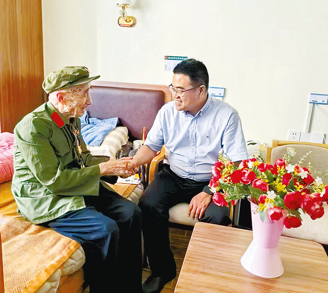 在纪念中国人民抗日战争暨世界反法西斯战争胜利80周年之际,为传承红色基因、弘扬抗战精神,省委老干部局副局长陈约翰一行与福建能源石化集团领导共同走访慰问了106岁高龄的抗战老兵傅士林和100岁抗战老同志王得秀,向他们致以崇高敬意和诚挚祝福。