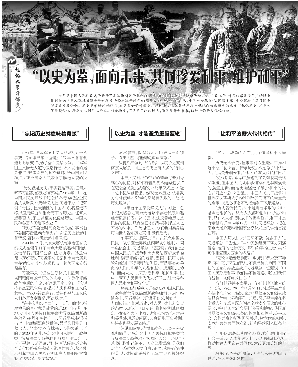“忘记历史就意味着背叛”“以史为鉴,才能避免重蹈覆辙”“让和平的薪火代代相传”