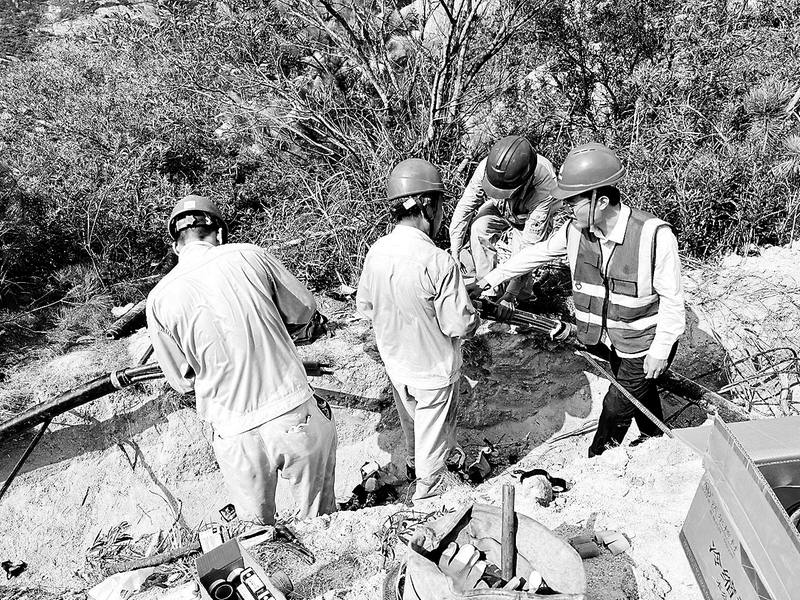 8月24日,福能新能源公司顶岩山风电场年检工作正如火如荼地展开。图为检修员们顶着烈日对存在隐患的电缆接头进行重新制作。 (卢毅越林剑辉 摄)