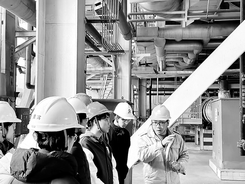 1月14日,福州大学42名师生赴晋南热电公司开展参观研学活动。通过理论与实践结合,学生们对热电行业的高效清洁生产有了更深刻的认识。图为运行部锅炉主管陈庆丰为福州大学学生讲解晋南热电锅炉燃烧工艺流程。 (李晓佳 摄)