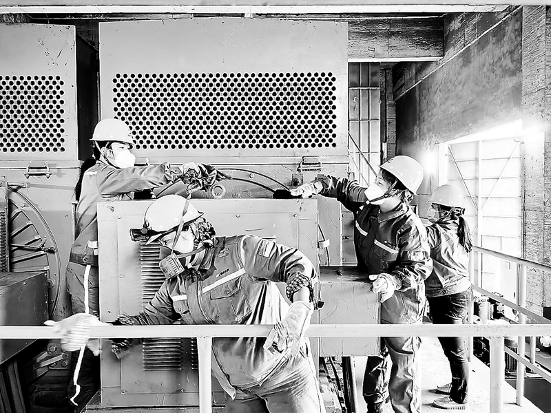 图为大修期间女职工在A组辊压机旁为电机擦拭油污